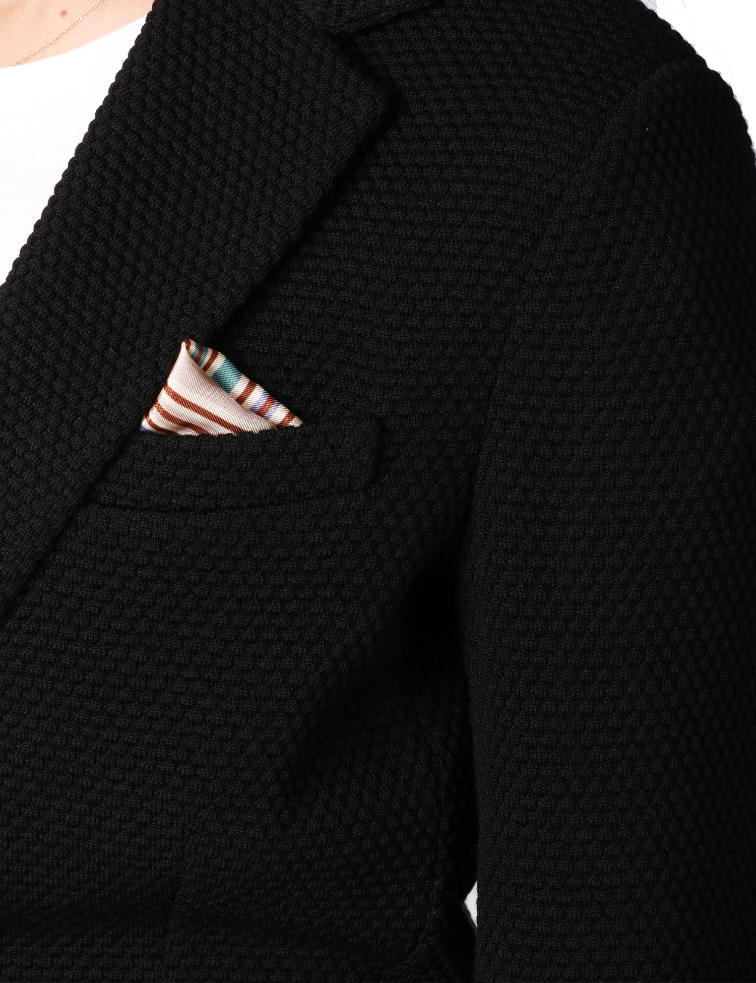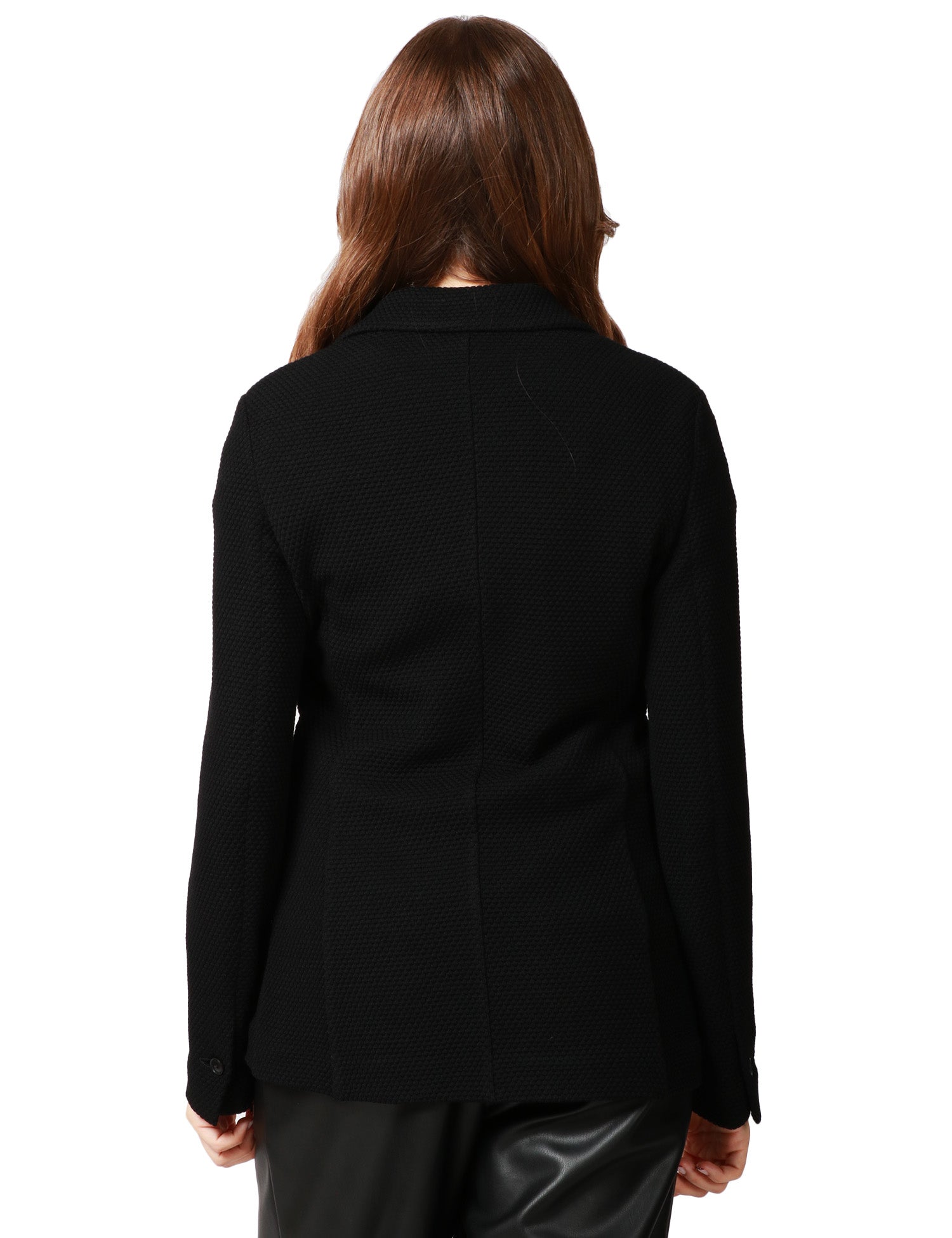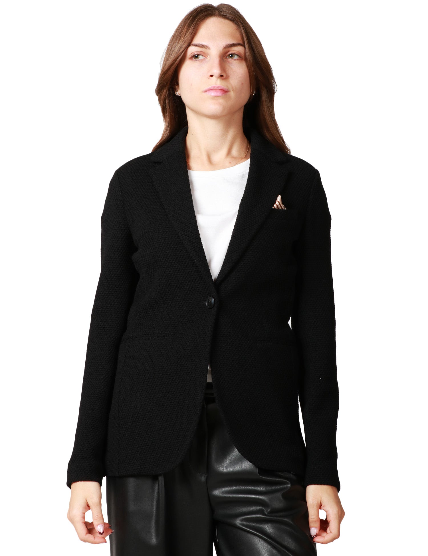 Giacca donna CIRCOLO nera monopetto con bottone singolo in tono. Caratterizzata dala trama a nido d'ape. Collo rever classico. Taschino con pochette. Linea slim.Stile: