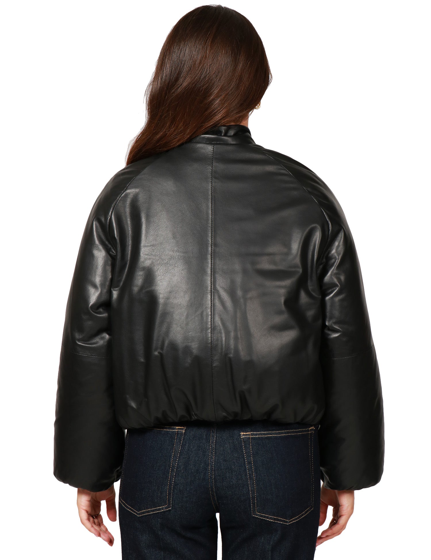 Bomber donna D FOUR nero in vera pelle di agnello italiana di alta qualità. Chiusura con zip metallica bidirezionale. Tasche laterali. Manica a palloncino.Stile: