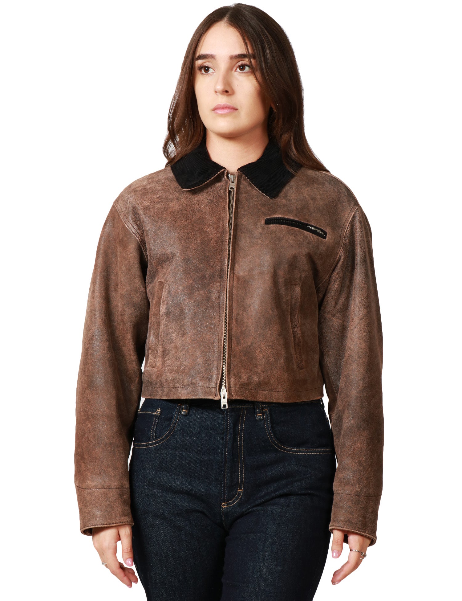 Giubbino D FOUR moro dal taglio crop in vera pelle con effetto invecchiato. Chiusura con zip metallica bidirezionale. Tasche laterali. Taschino sul petto con zip. Colletto stile camicia in velluto a costine. Reallizzato in vera pelle italiana di alta qualità.Stile: