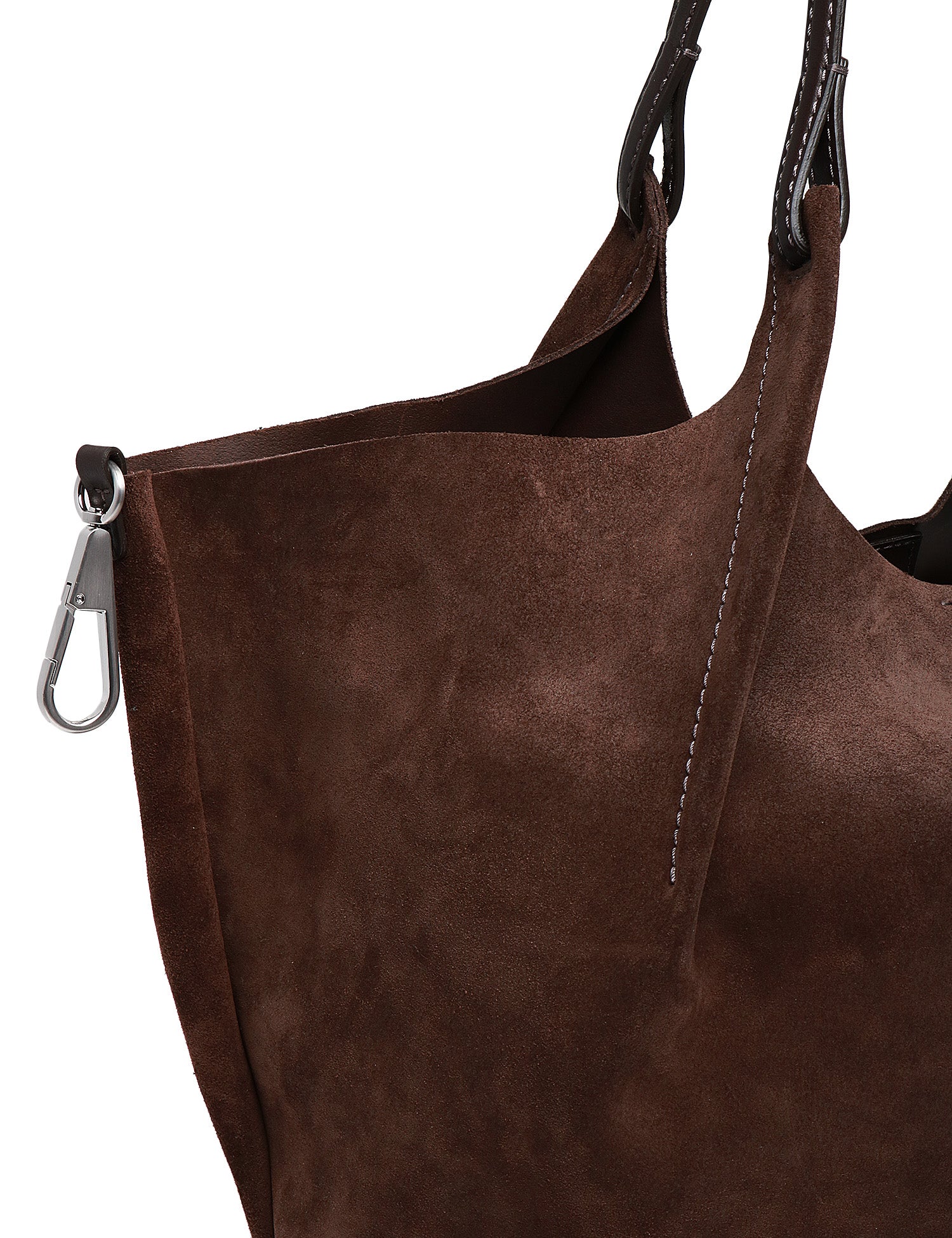 DUA si distingue per un design semplice, ma contemporaneo. Realizzata in morbida pelle scamosciata moka, presenta un monoscomparto sfoderato, profili superiori in pelle martellata e doppi manici in tono. Pratica ed essenziale. Può essere portata a spalla. Dimensioni: 34x38x16 cm.Stile: