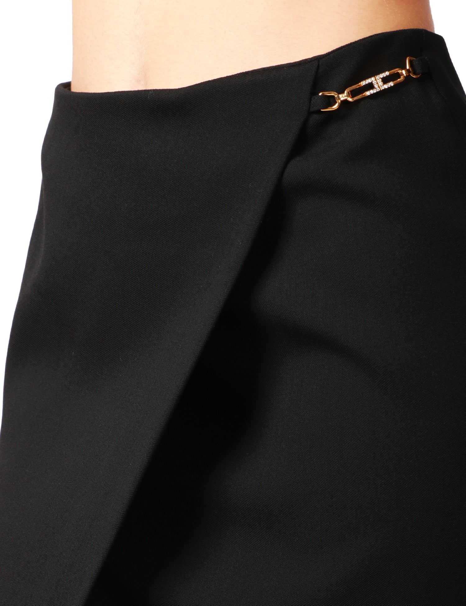 Gonna a tubino ELISABETTA FRANCHI nera in crêpe dalla vestibilità slim. Si distingue per la costruzione con pannello asimmetrico ed è impreziosita su un fianco dal dettaglio gioiello in metallo dorato con logo e strass.- Fodera in raso monogram