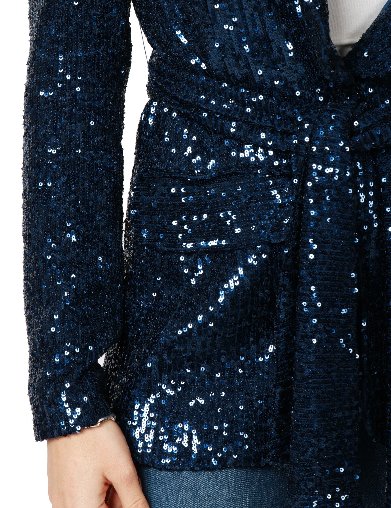 GIACCA DONNA CAROL RUIZ BLU NOTTE CON PAILLETTES ALL OVER E CINTURA IN VITA