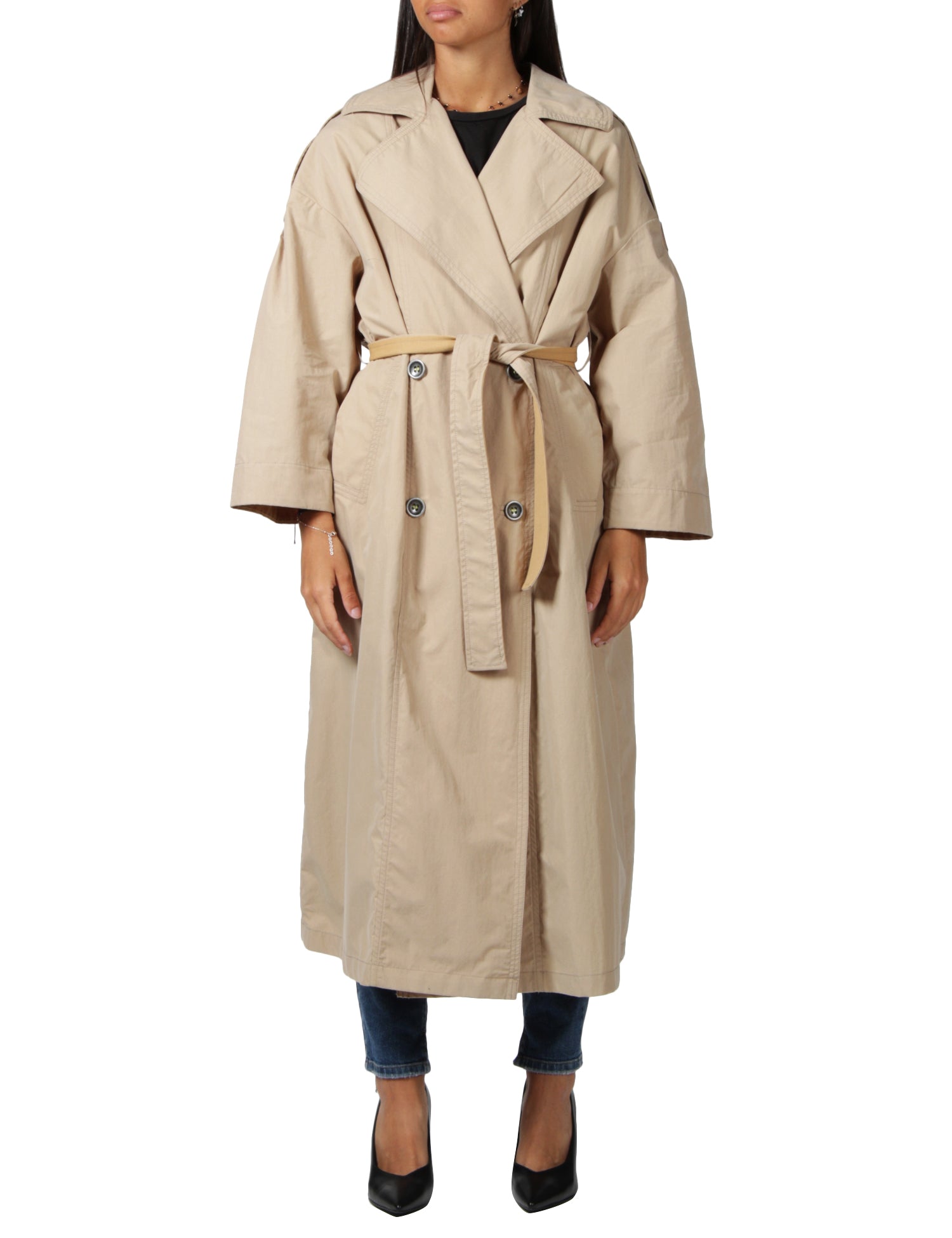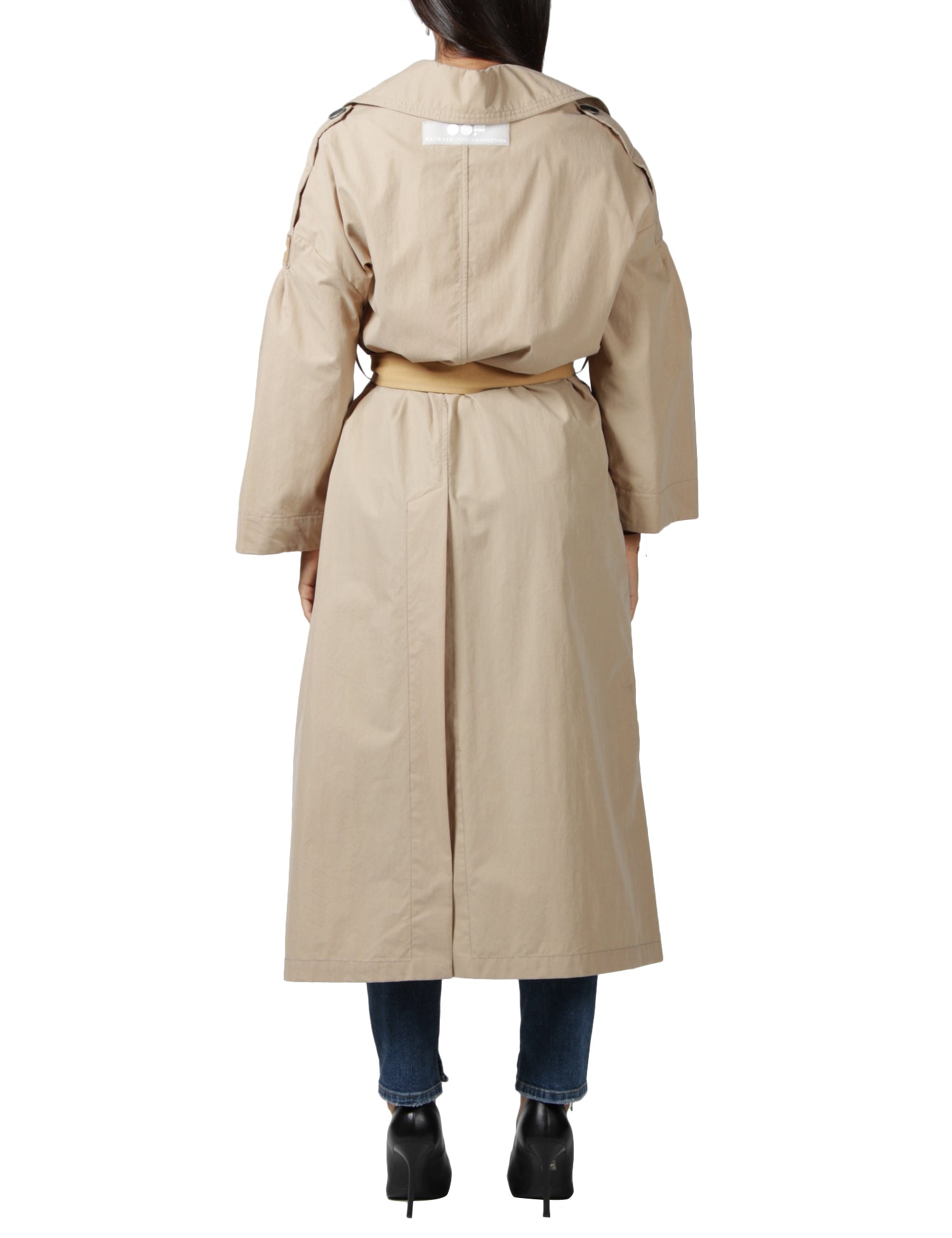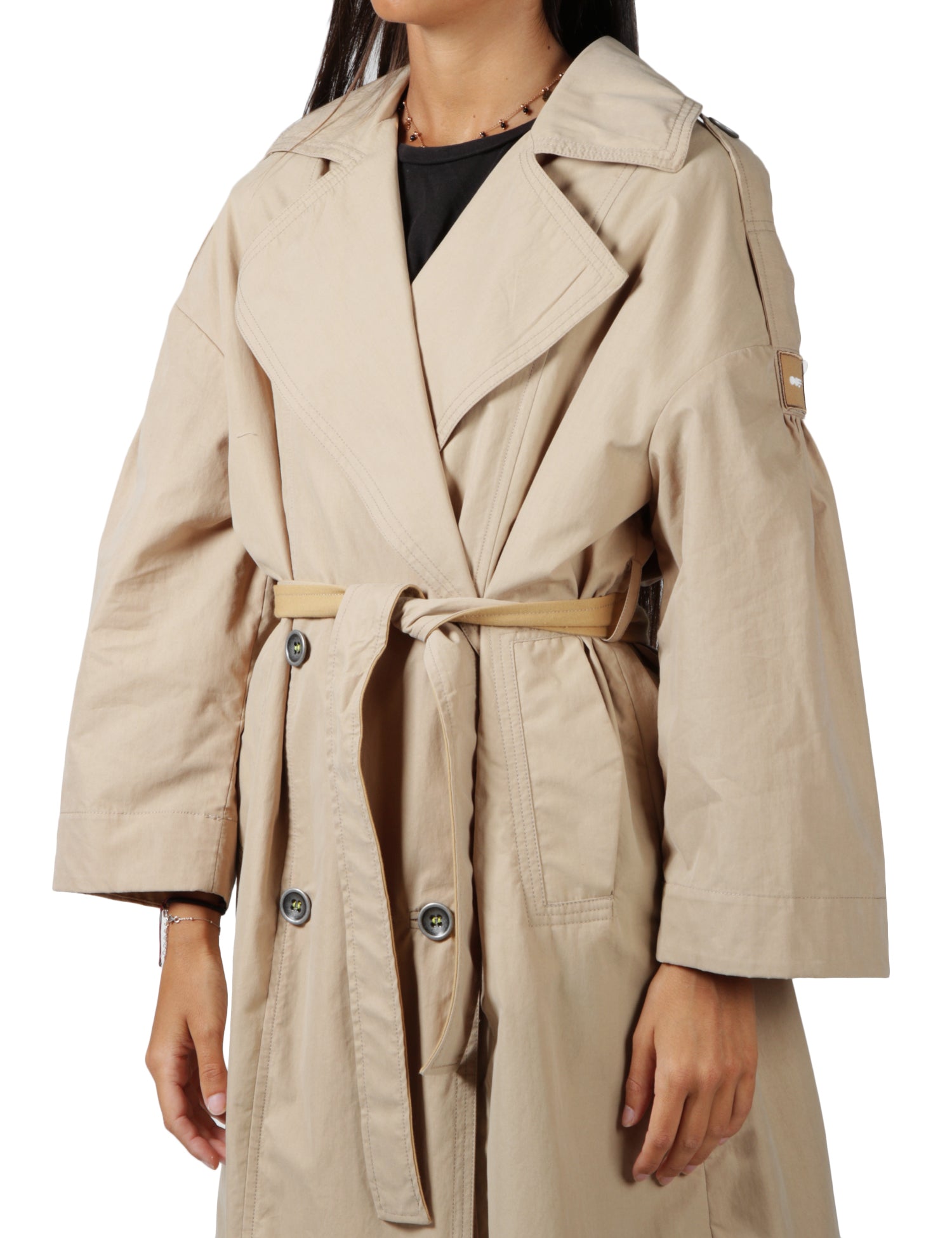 Trench lungo da donna. Scollatura con revers ampi e profondi. Abbottonatura doppio petto, chiusura con bottoni in metallo. Tasche laterali inclinate sul fianco. Cintura in vita rimovibile e reversibile. Spalla scesa con sbuffo. Dettaglio in velcro con logo sul petto.