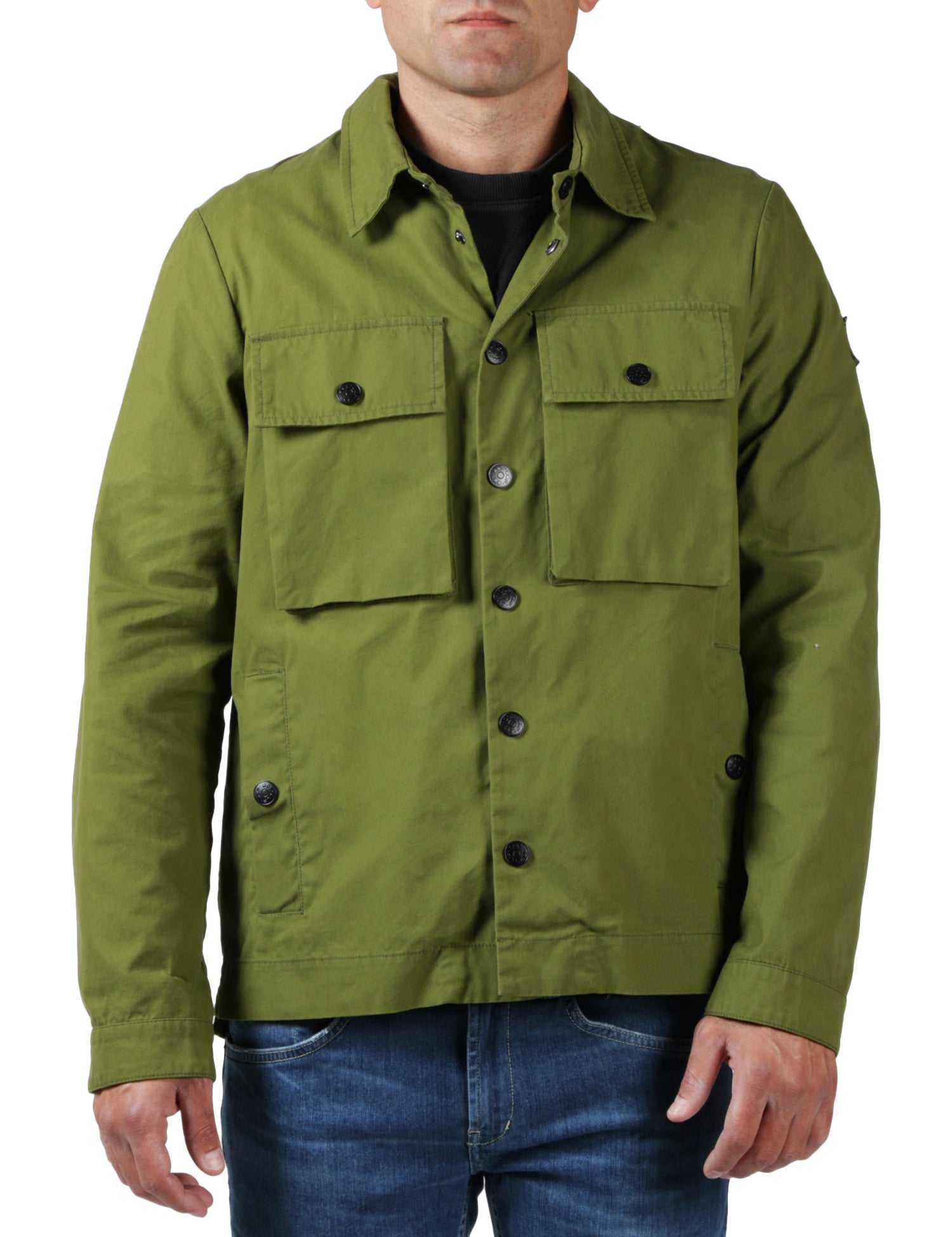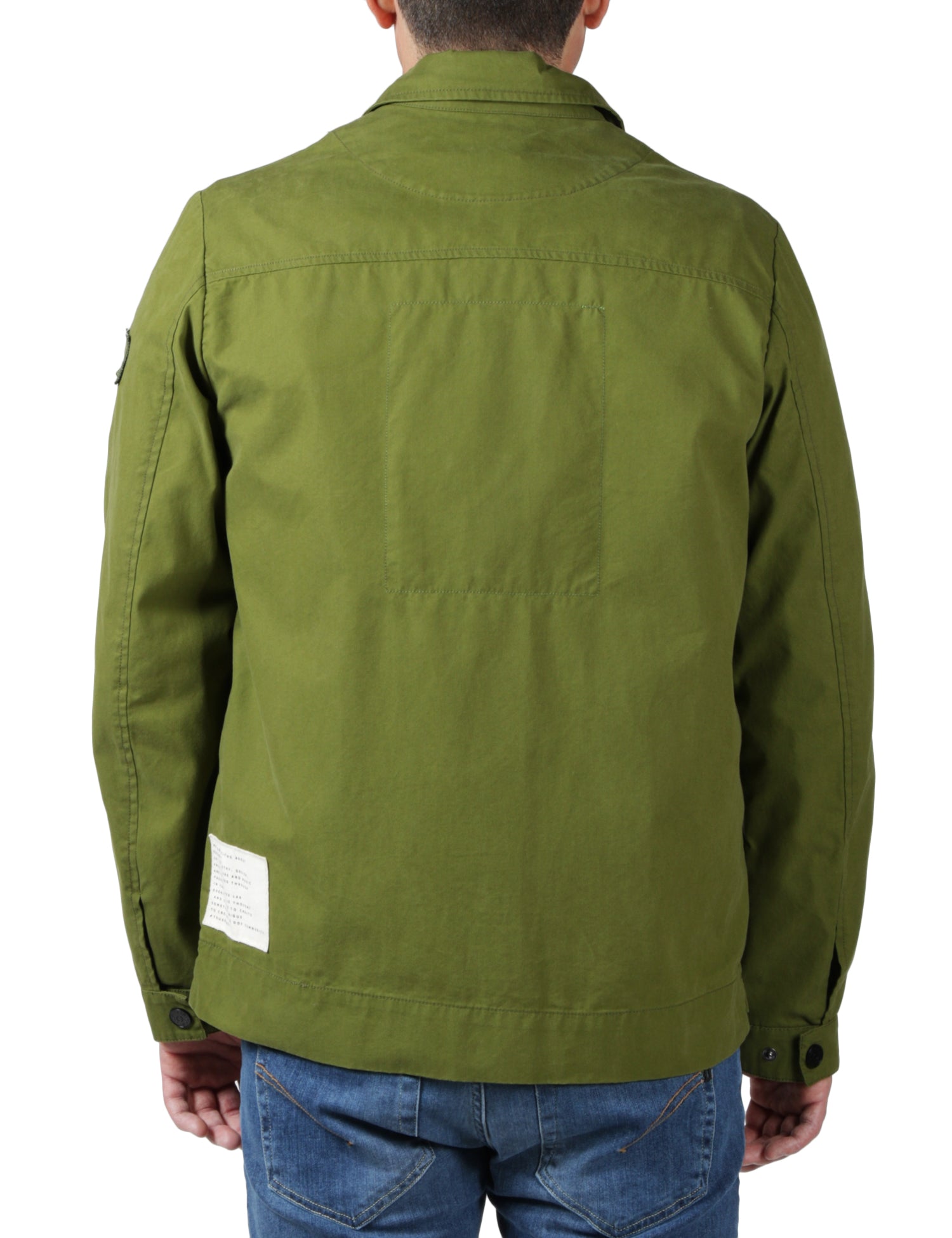 La giacca presenta un colletto a camicia. Polsino chiuso da cinturino con bottone a pressione visibile. Due ampie tasche a soffietto sul petto, oltre a due tasche verticali sui fianchi. Bottoni automatici con logo sulla chiusura frontale e tasche.
