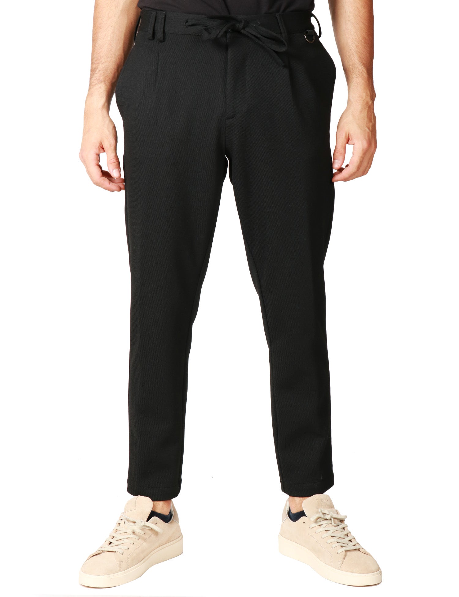 Pantalone uomo OFFICINA 36 Winnona nero. Vita regolabile con coulisse. Tasche laterali a filetto e tasche posteriori a toppa con patta e bottone. Pence singola davanti. Carrot fit.Stile: