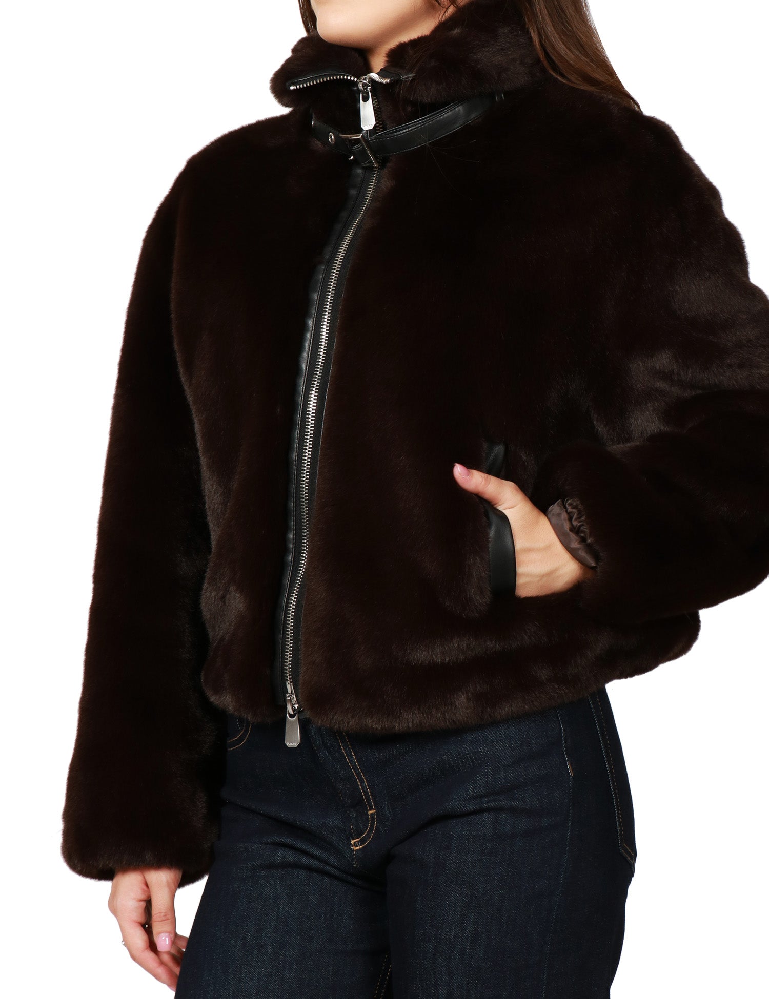 ECOPELLICCIA DONNA PINKO ESTEBANA MARRONE CON COLLO ALTO E PROFILI IN ECOPELLE