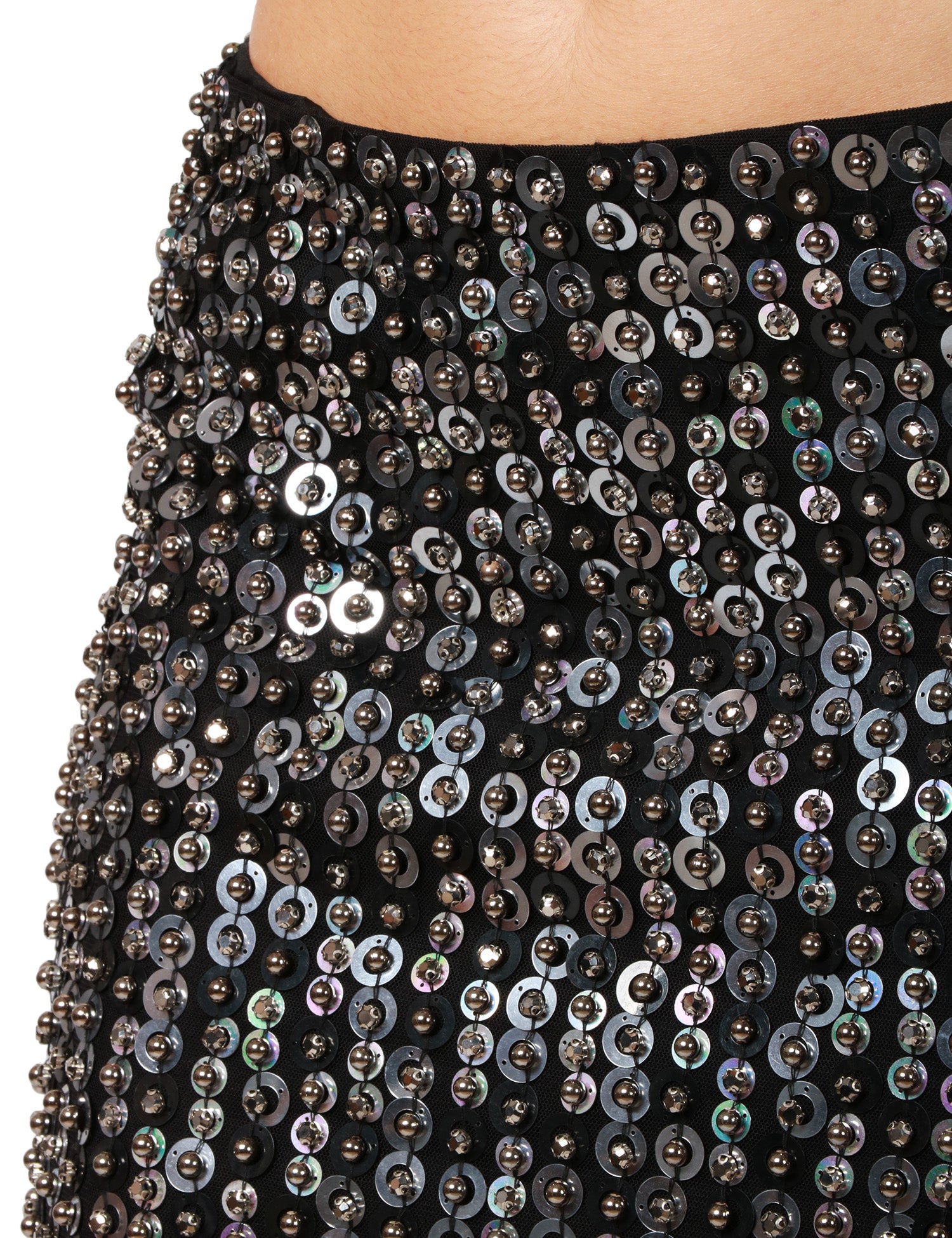 Gonna longuette a tubino PINKO "Passaparola" impreziosita da una cascata di paillettes rotonde con all'interno cristalli di vetro e piccole sfere metalliche che creano luminosi riflessi nei toni del nero e del blu. Il fondo del capo è rifinito da sottili frange che ricadono in modo leggero e che conferiscono un tocco di dinamicità e movimento in puro stile PINKO.Stile: