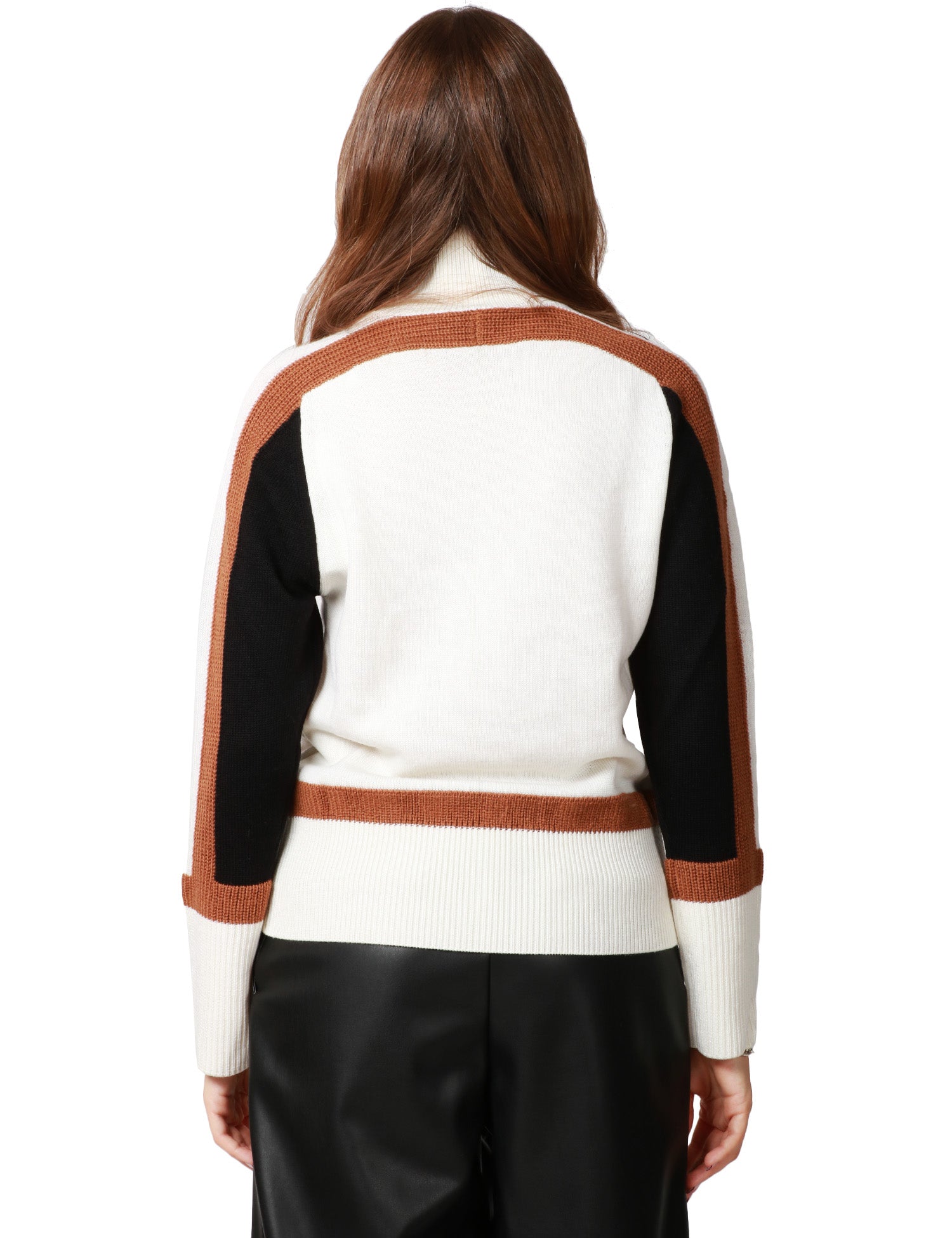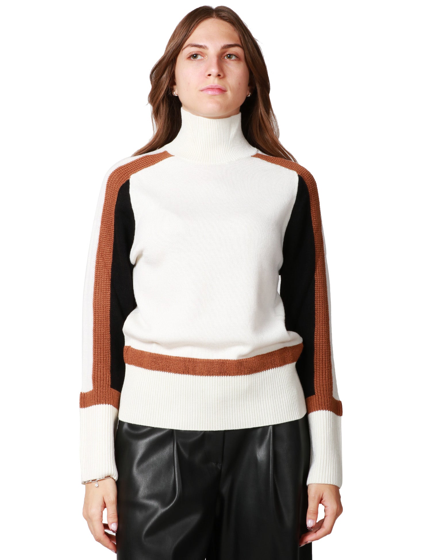 Maglia donna ALPHA STUDIO latte a collo alto. Presenta dettagli a contrasto sulle maniche e sulla vita. In lana.Stile: