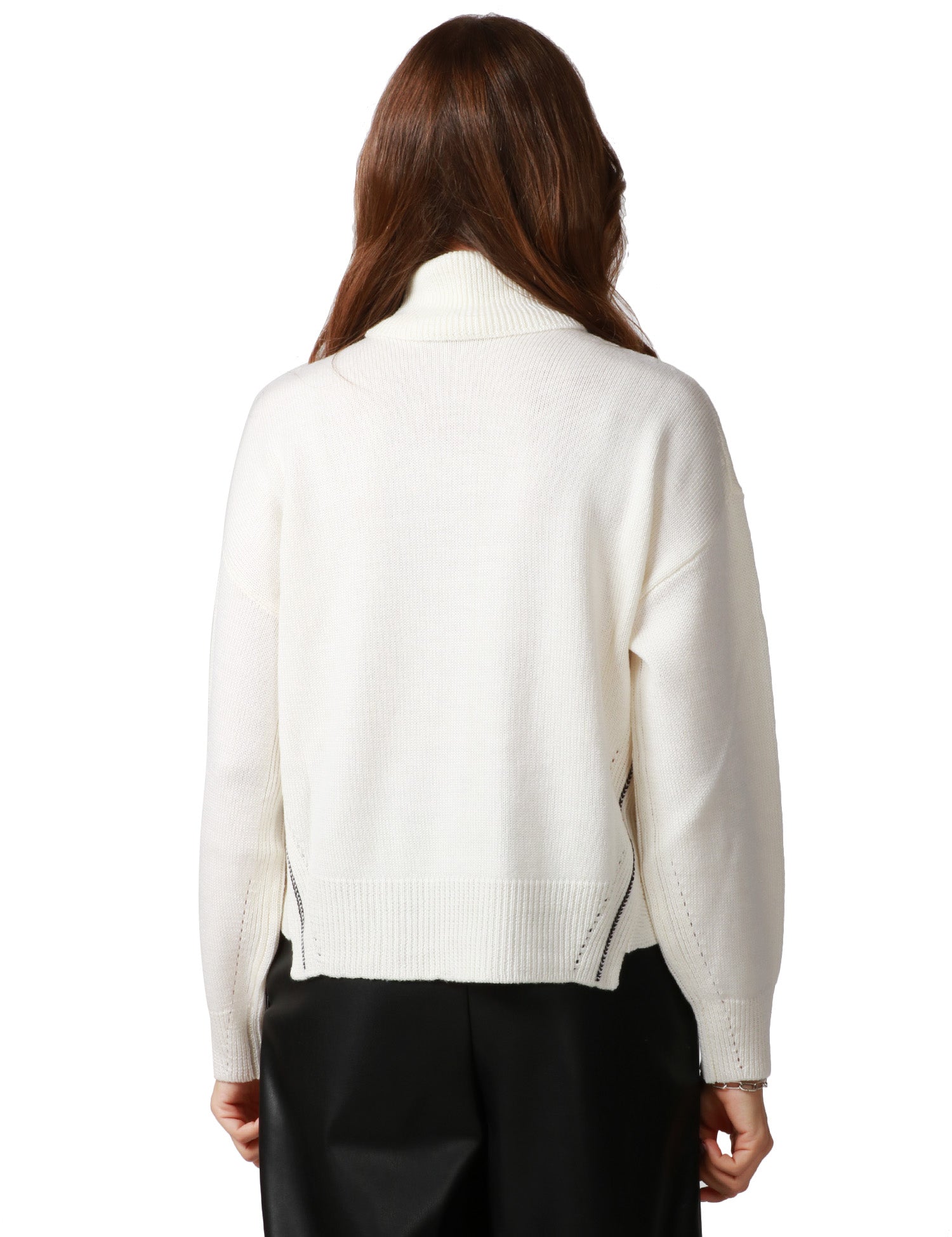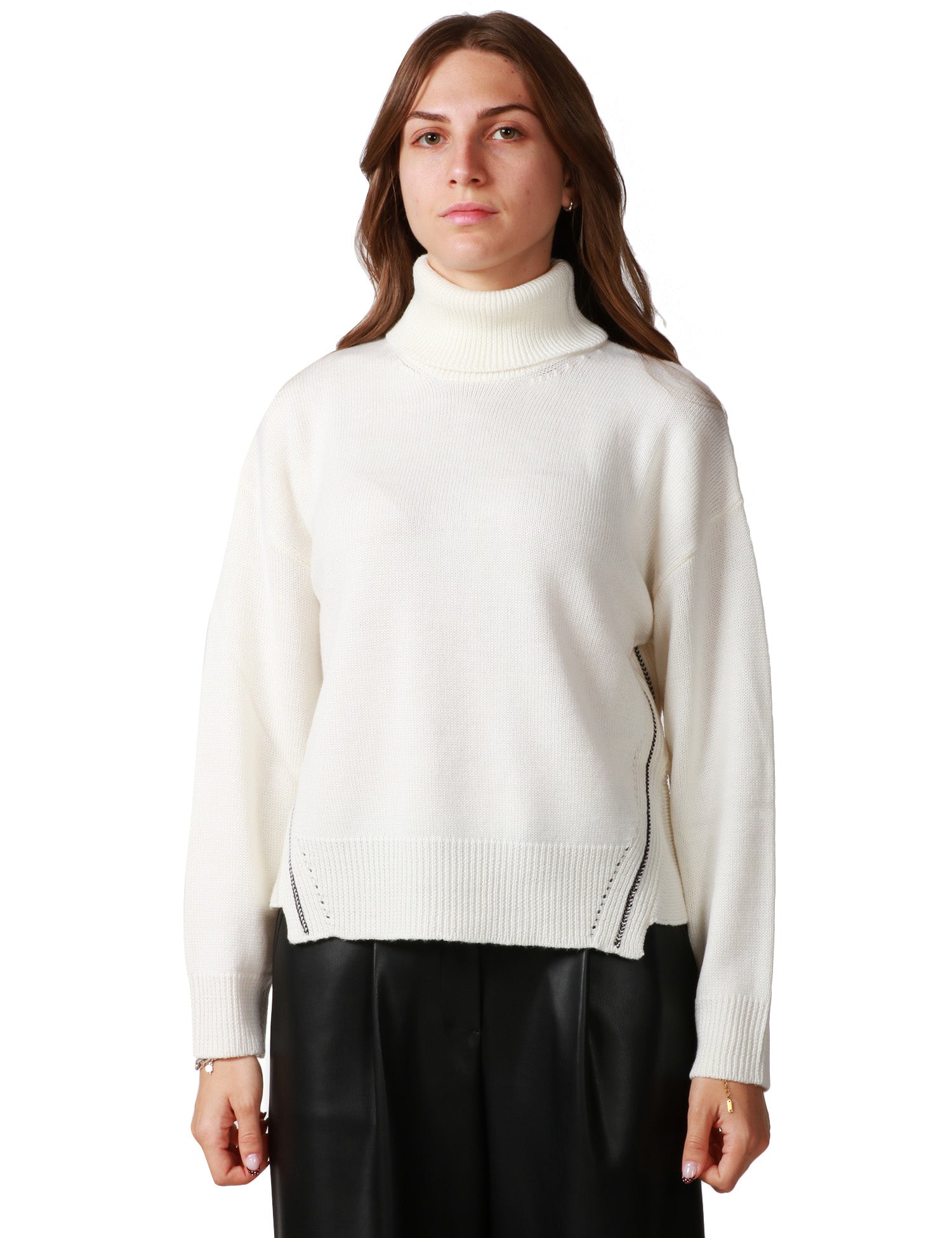 Maglia donna ALPHA STUDIO dolcevita latte. Presenta cuciture tricot a contrasto lungo i fianchi. 100% lana merinos.Stile: