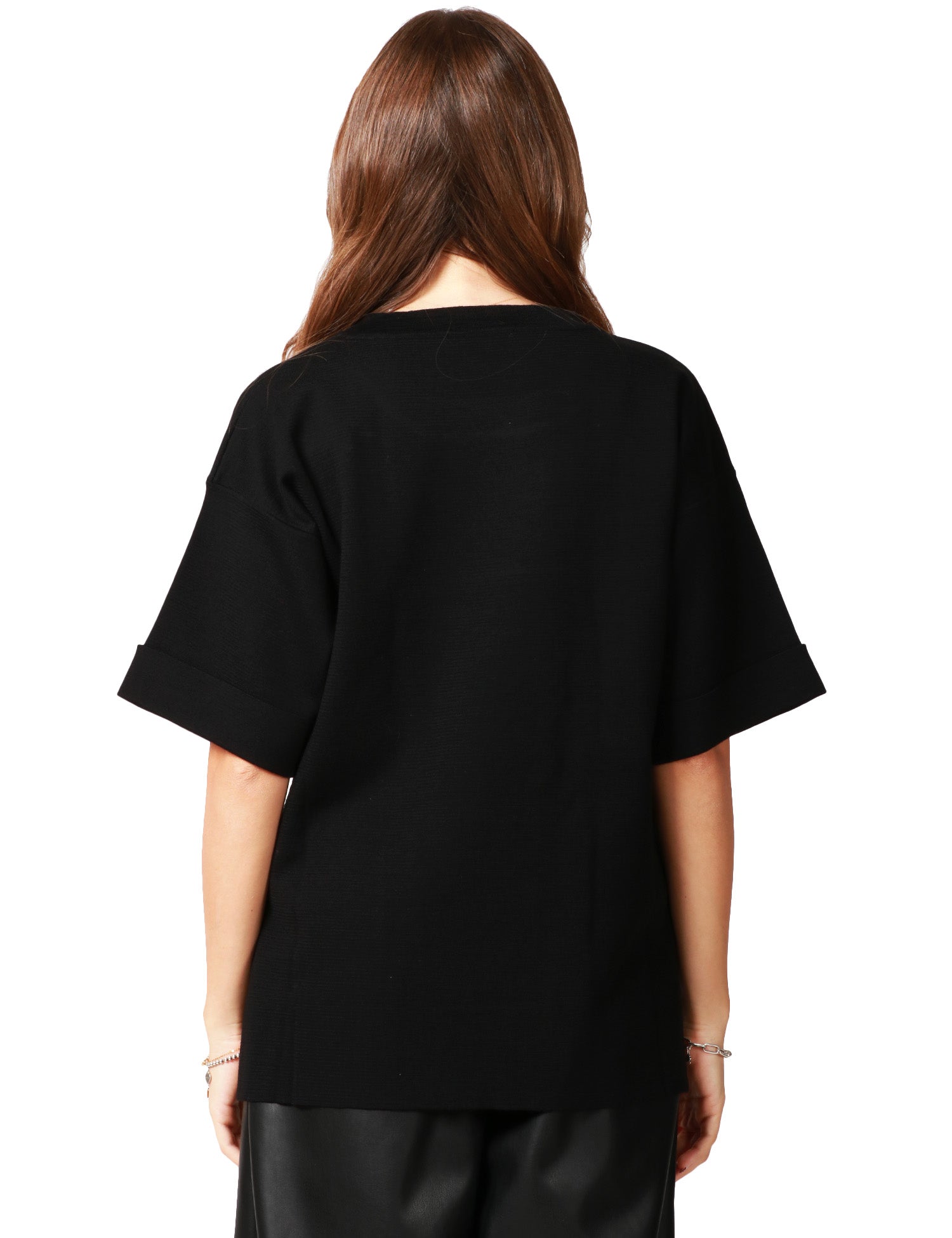 Maglia over ALPHA STUDIO nera. Girocollo con risvolto sulla manica. Impreziosita da dettaglio gioiello sul lato sinistro del petto. In maglia punto stoffa.Stile: