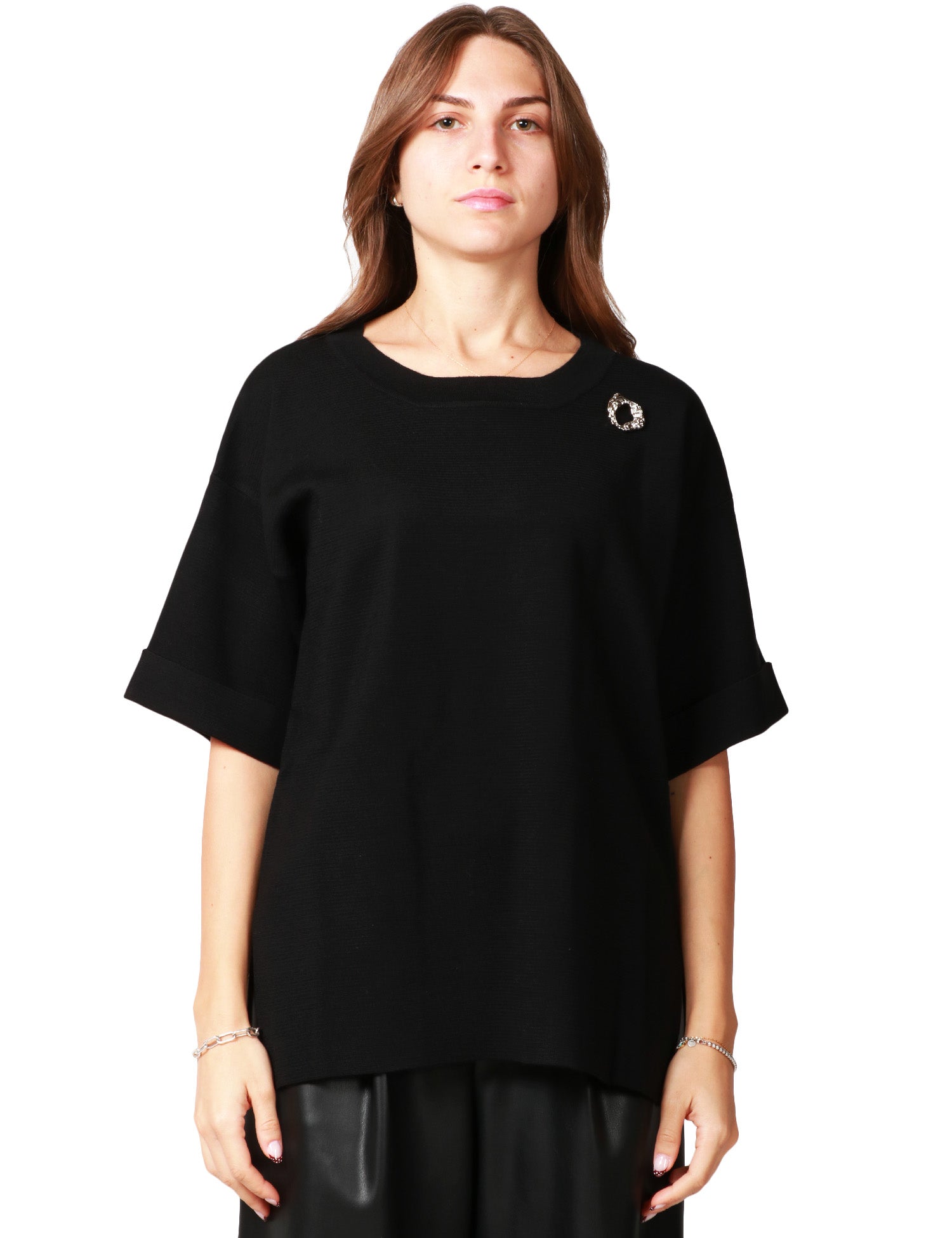 MAGLIA DONNA ALPHA STUDIO NERA OVER A MEZZA MANICA CON DETTAGLIO GIOIELLO SUL PETTO