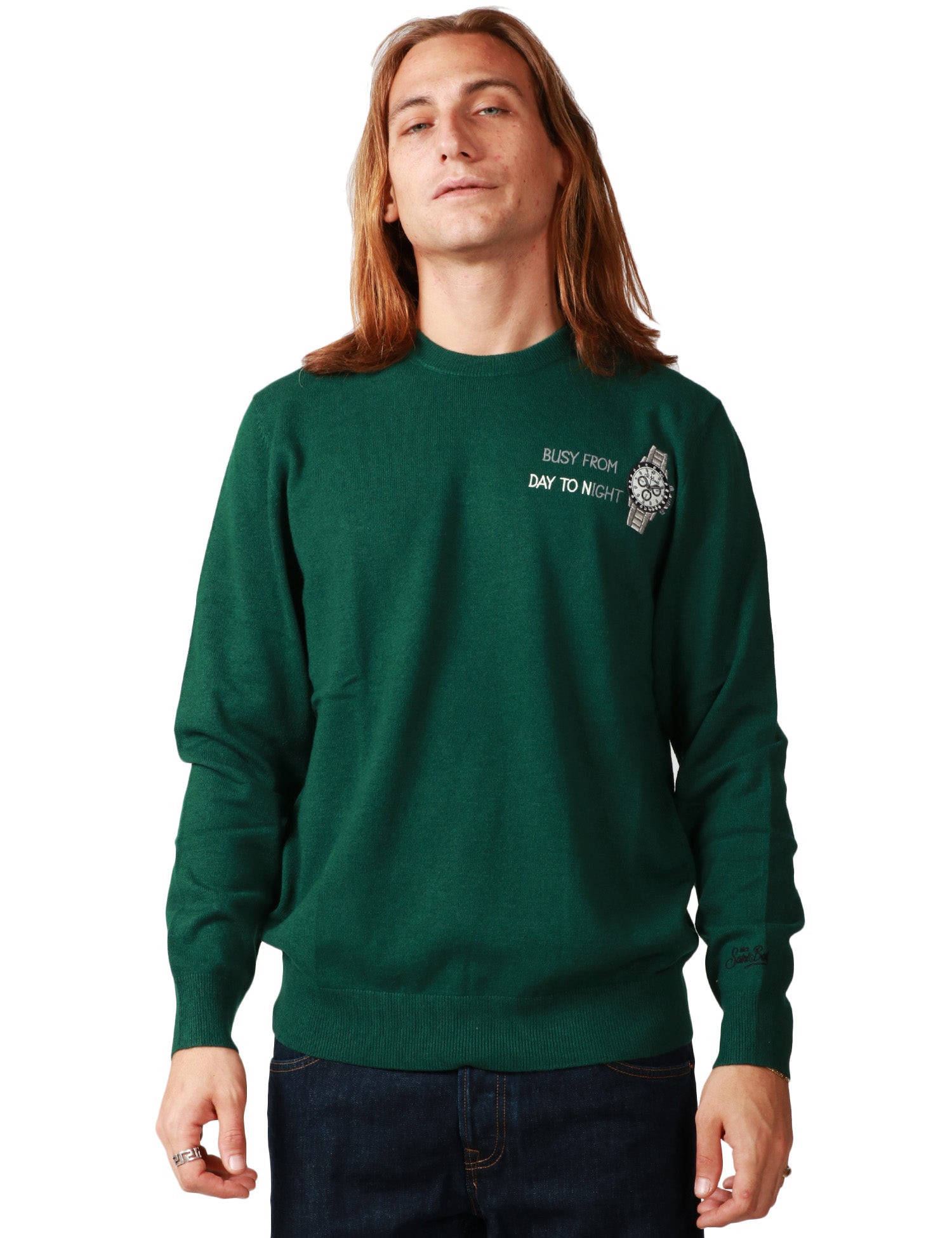 MAGLIONE UOMO MC 2 SAINT BARTH GREEN CON RICAMO "BUSY FROM DAY TO NIGHT" E OROLOGIO IN MISTO CASHMERE