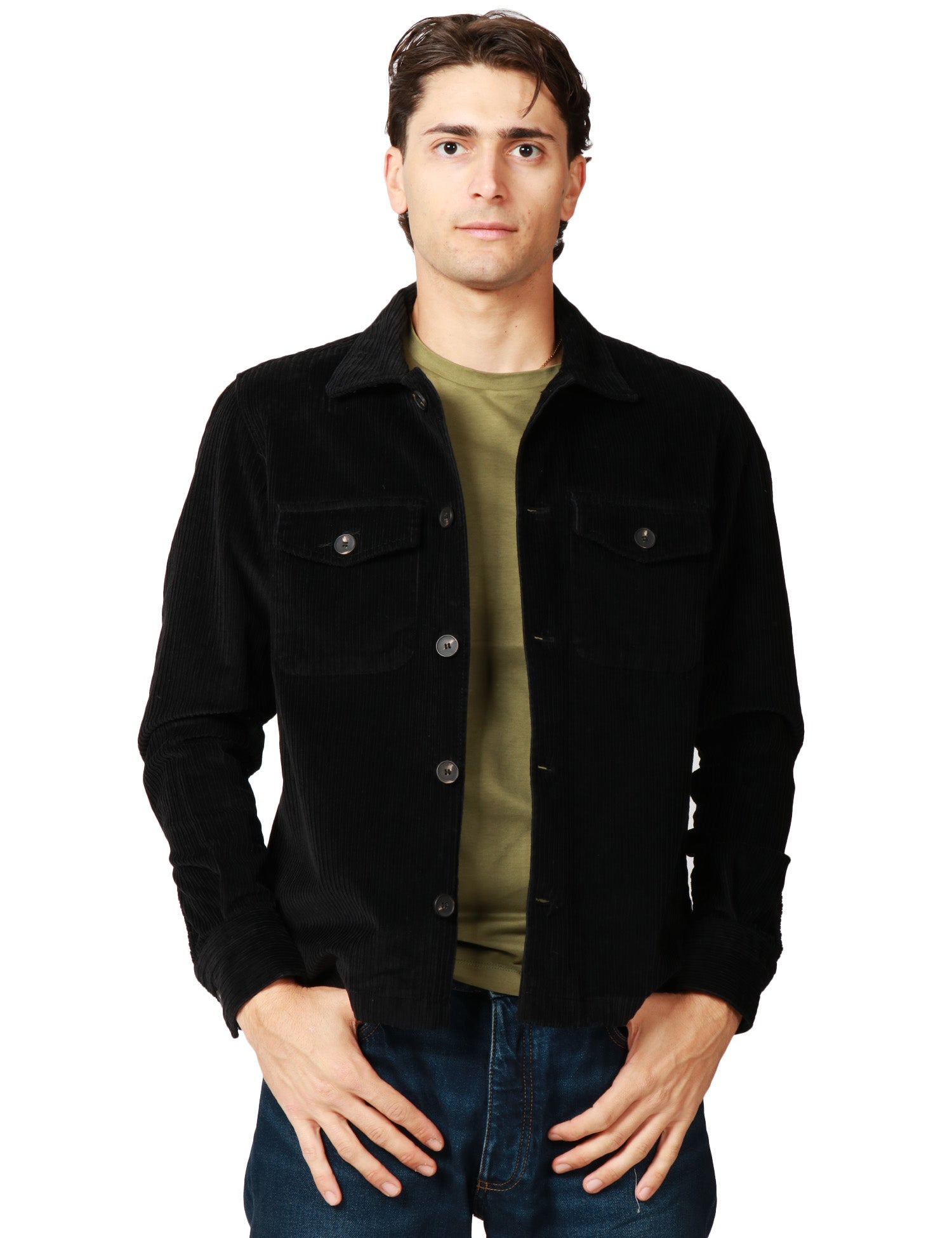 Giacca camicia PORTOFIORI nera in velluto a coste. Colletto, bottoni a contrasto. Presenta tasche a toppa con patta e bottone all'altezza del petto. Vestibilità regular.Stile: