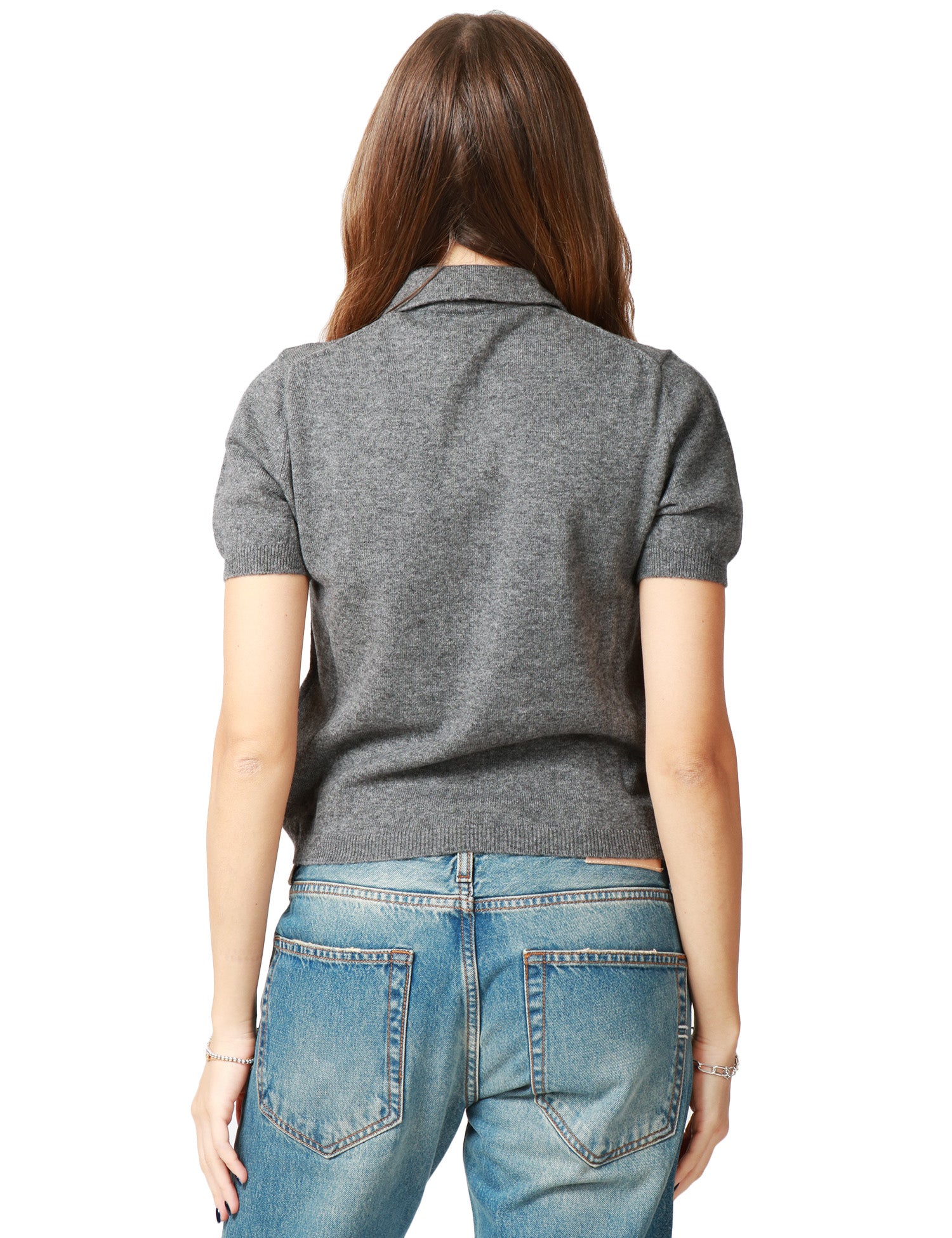 Polo ANNA MOLINARI grigio medio con mezza manica leggermente a palloncino. Colletto tondo e chiusura con due bottoni sullo scollo. Fondi a costine. 90% lana 10% cashmereStile: