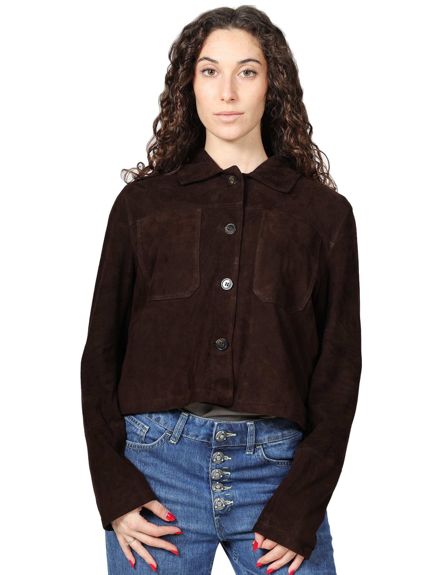 Giacca donna Blusotto modello LILIANA moro. Presenta colletto e abbottonatura centrale con 4 bottoni in tono. Tasche a toppa sul petto. 100% pelle d'agnello scamosciata.Stile: