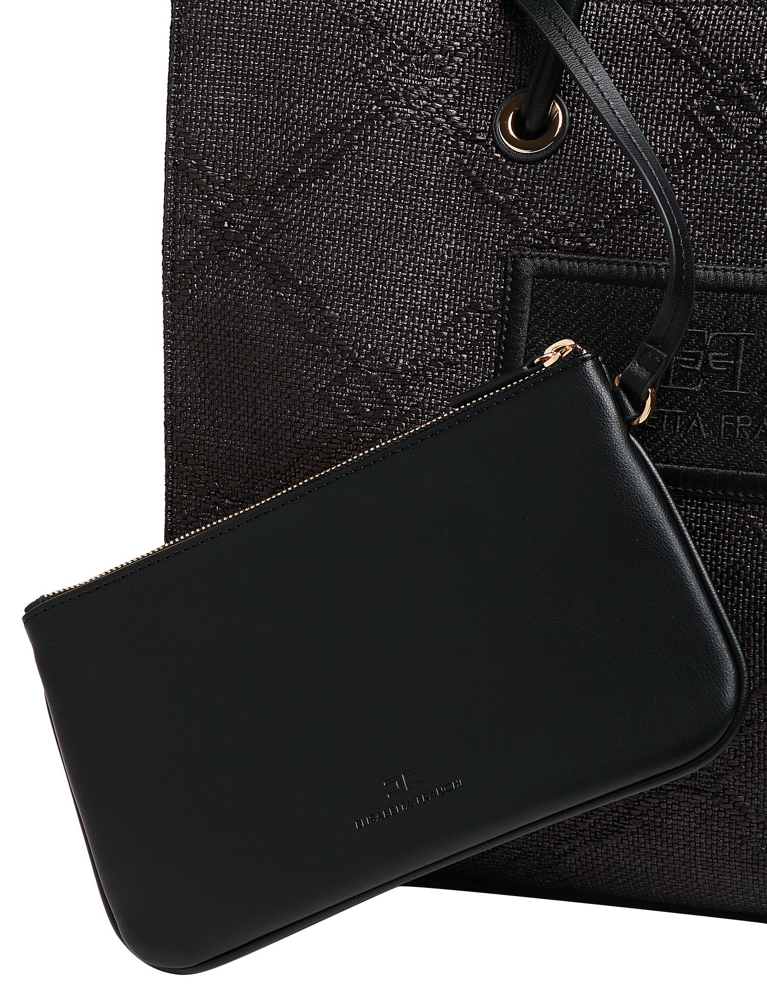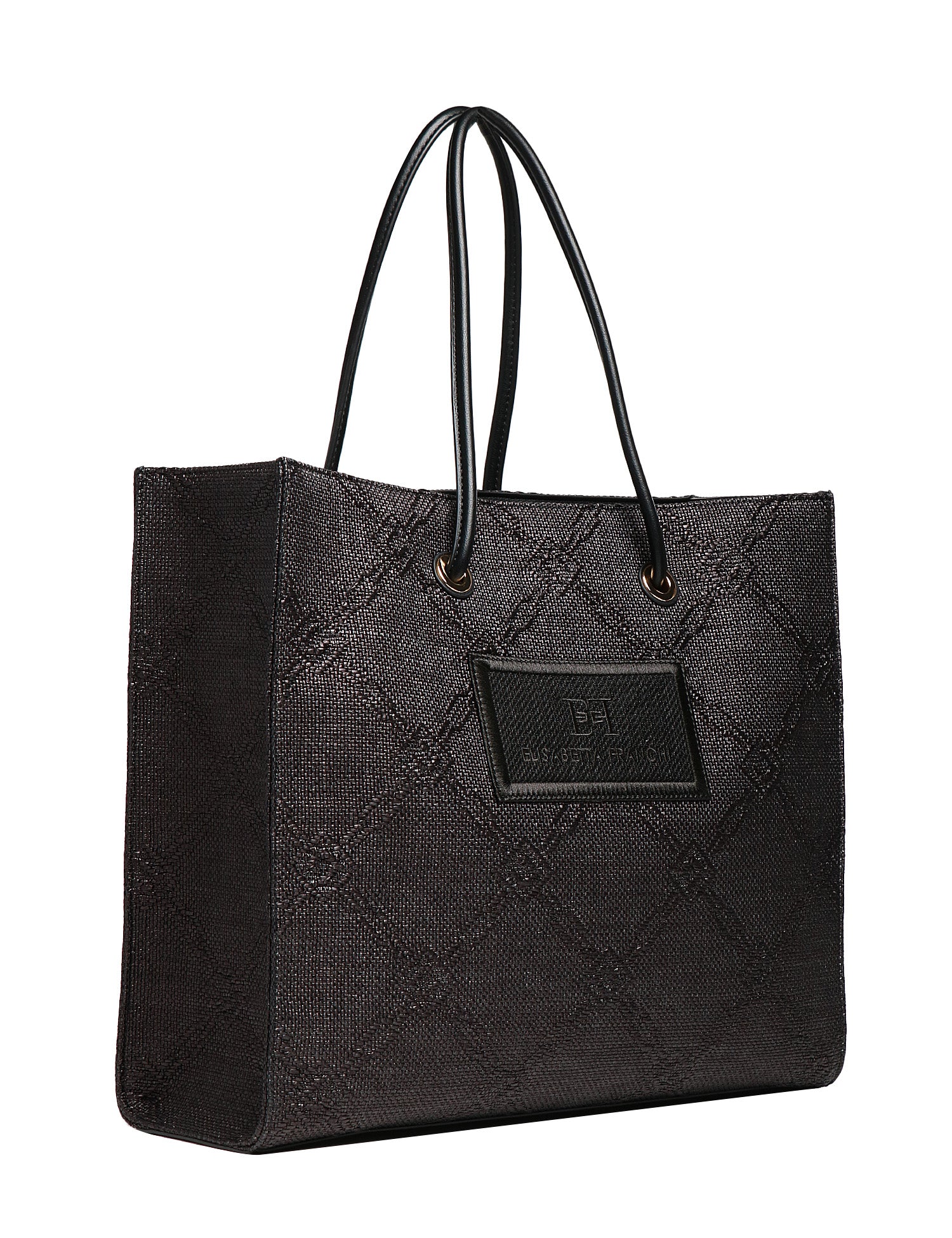 Borsa tote grande ELISABETTA FRANCHI nera realizzata in rafia jacquard con disegno a losanghe, impreziosita da dettagli in metallo dorato per una nota di luce. Una patch con logo ricamato completa l'accessorio.Stile: