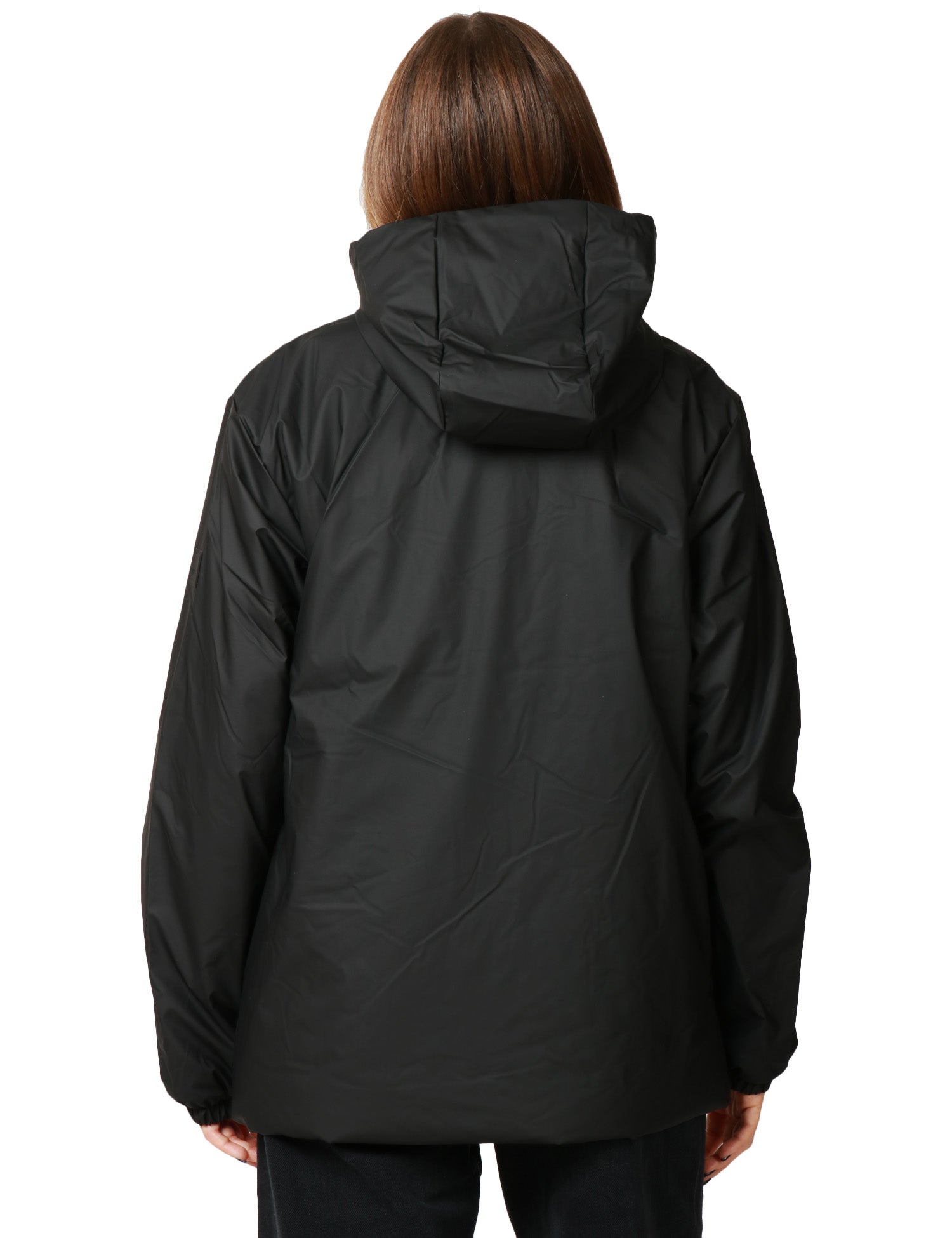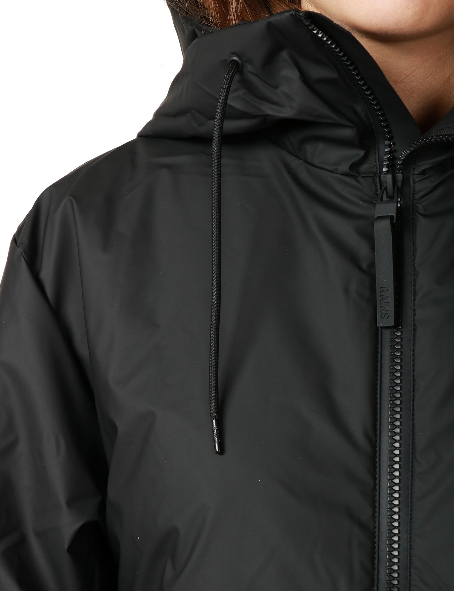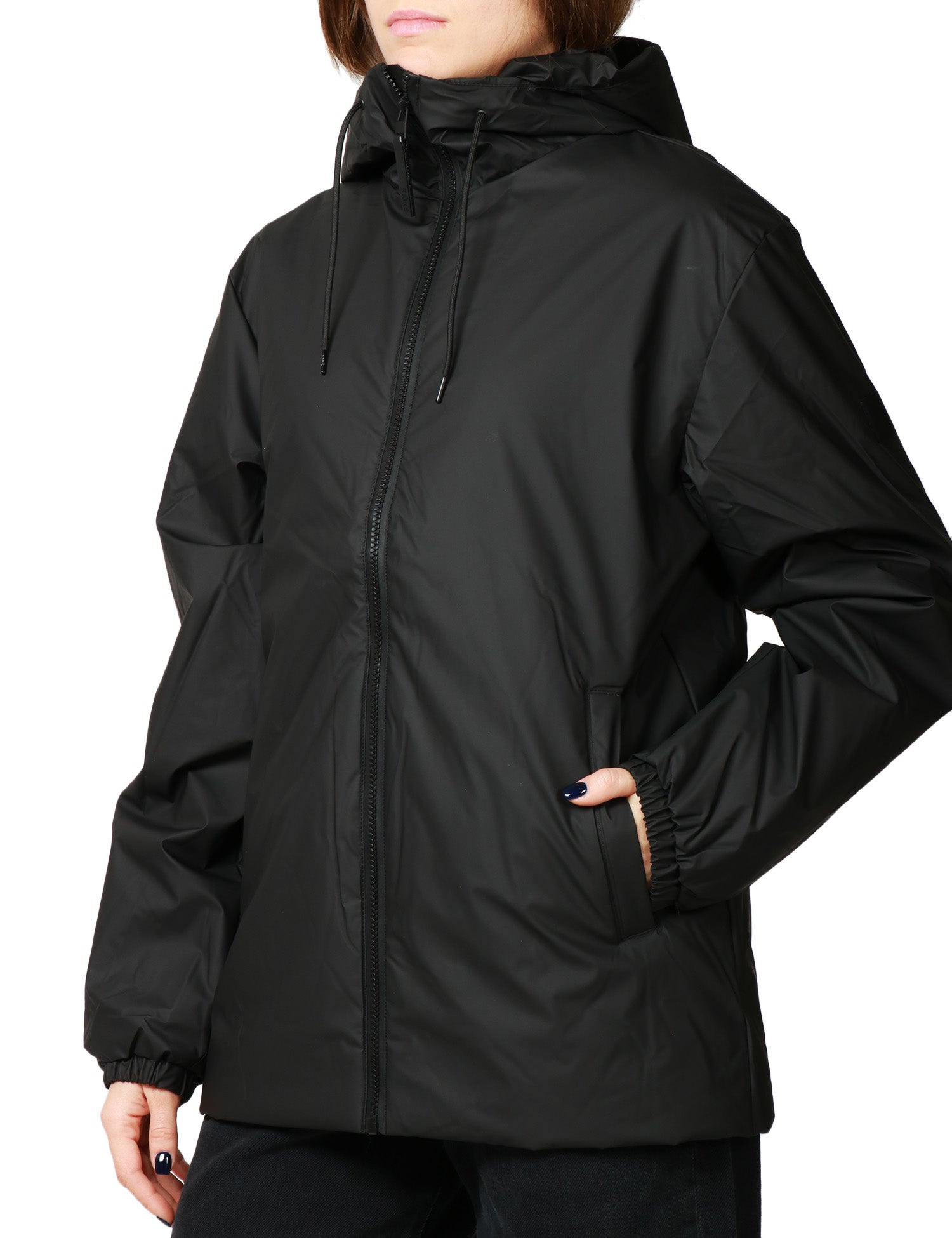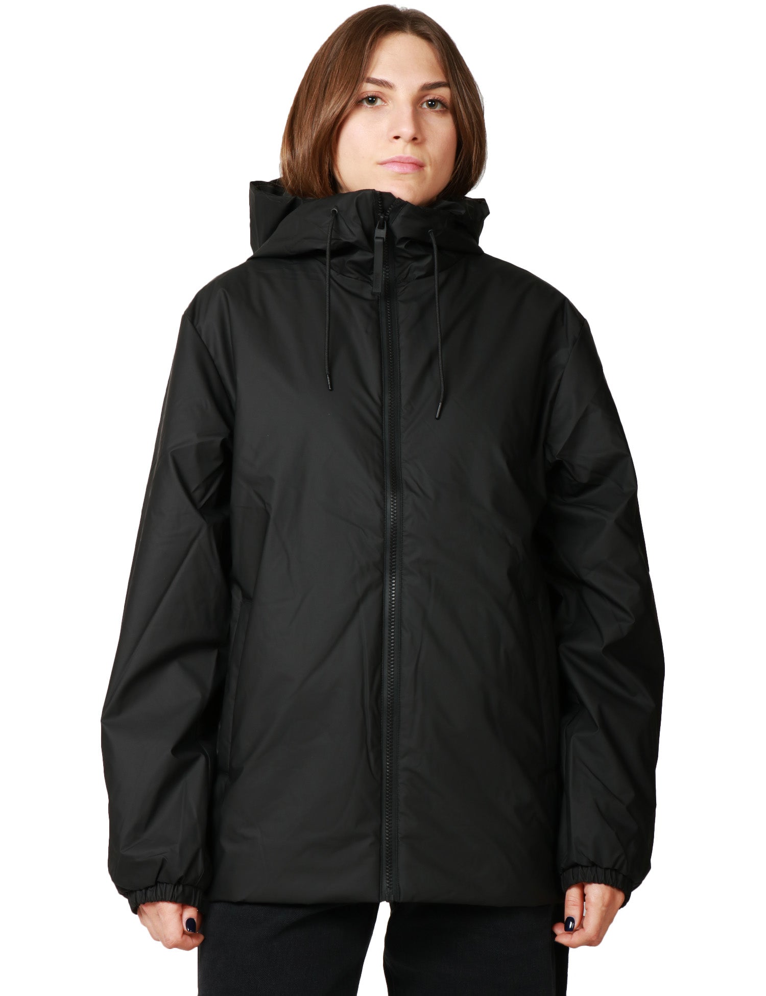 La Lohja Long Insulated Jacket nera presenta tasche laterali foderate in pile e polsini elasticizzati. Lunghezza maxi, imbottitura leggera e isolante. Realizzata nell'iconico tessuto PU di Rains impermeabile con cuciture a doppia saldatura. Il modello è completato da un cappuccio isolante con coulisse.Stile: