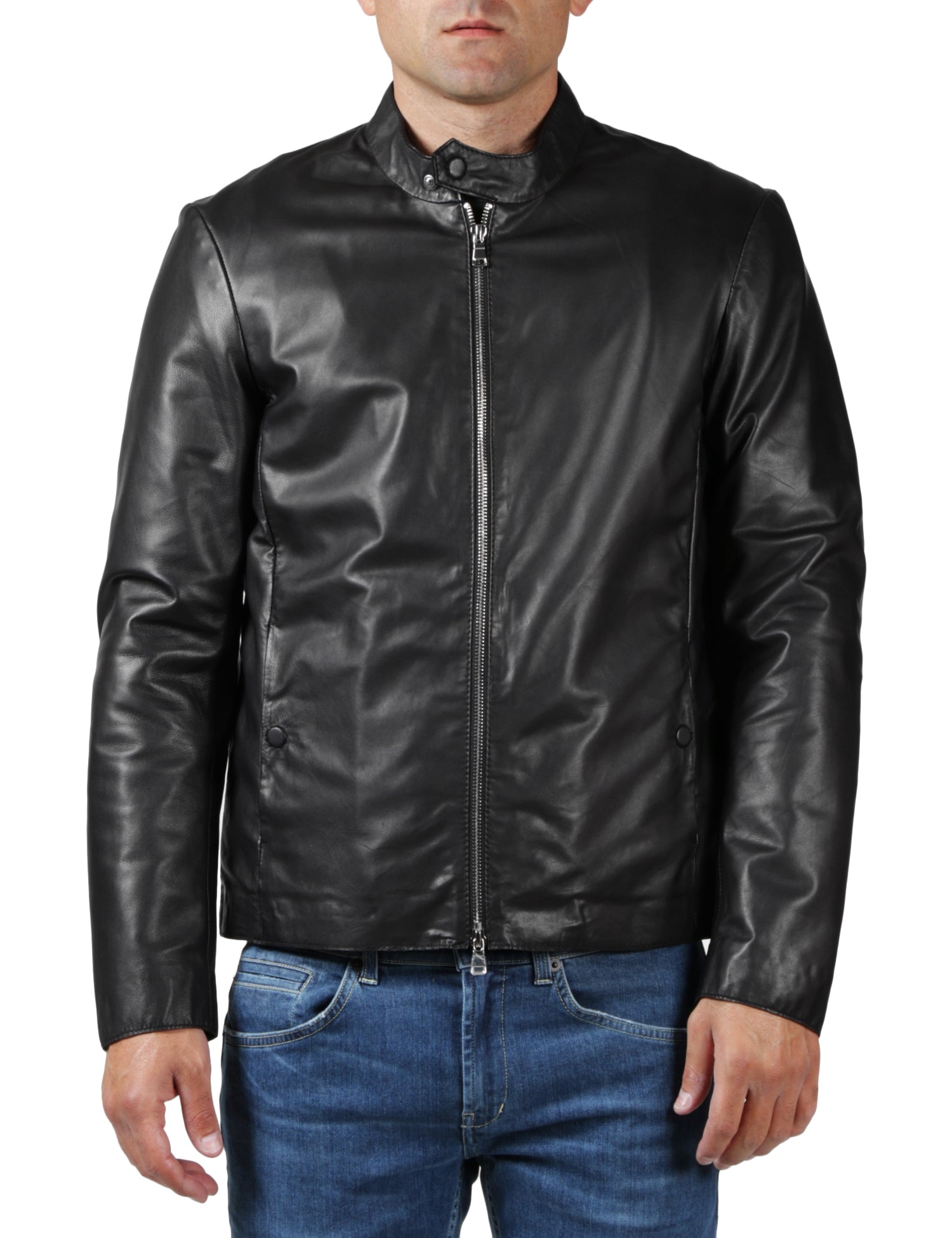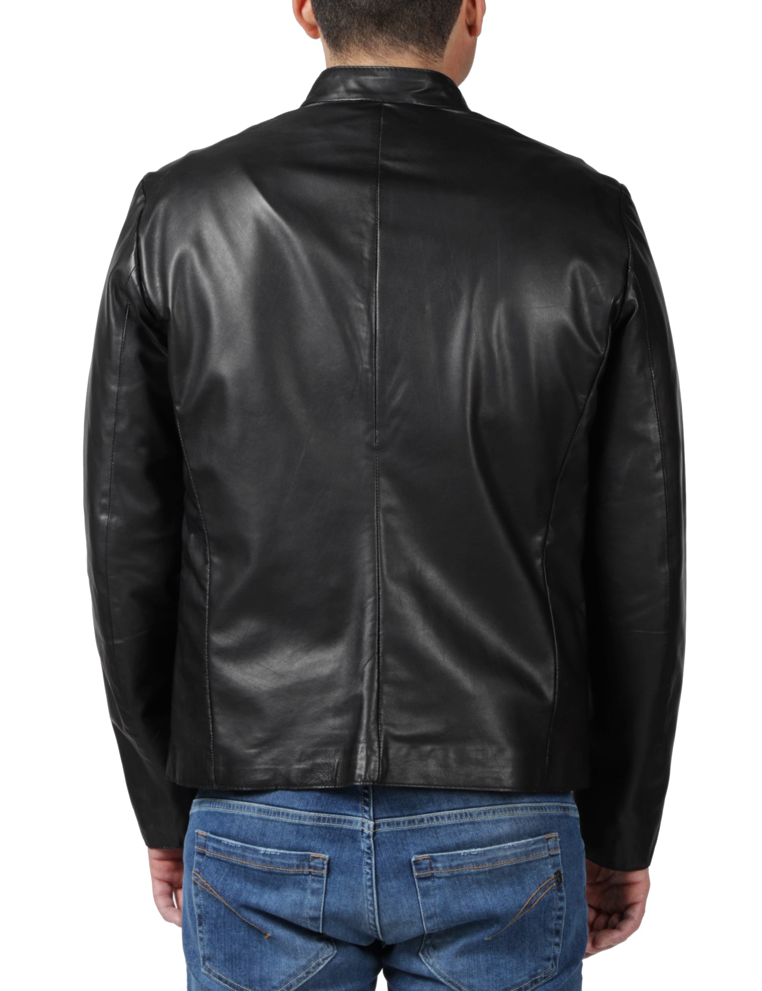 Giacca in pelle con zip con collo alla coreanaDettagli: