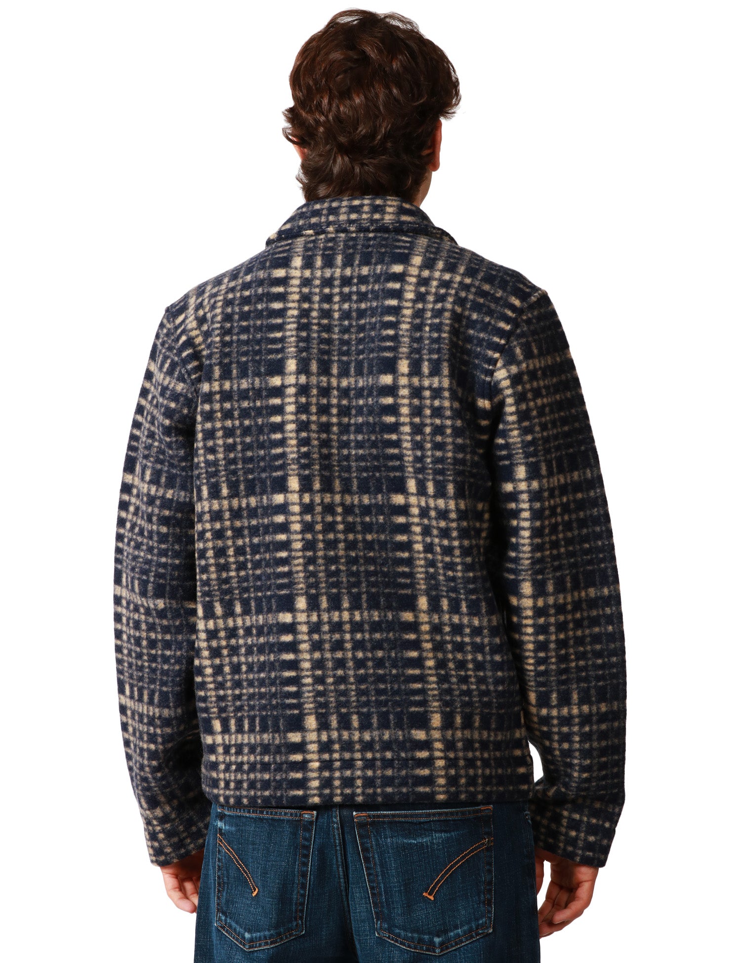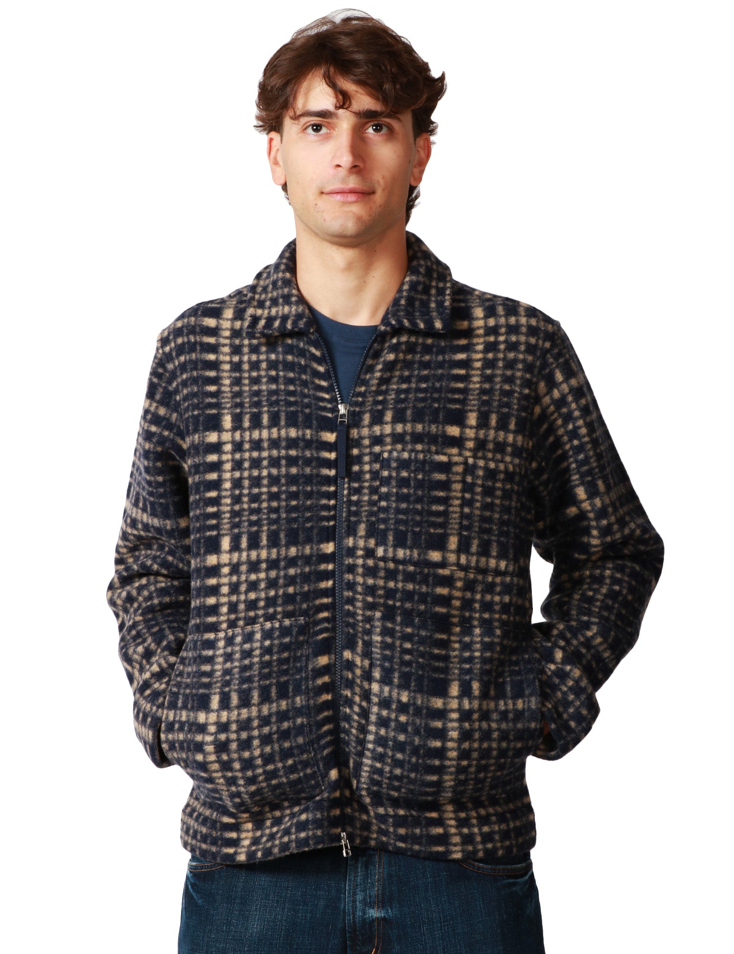 Giacca uomo UNIVERSAL WORKS Telepass blu navy/beige con motivo a quadri. Colletto e chiusura con zip bidirezionale. Tasche laterali e taschino in alto a sinistra. In lana.Stile: